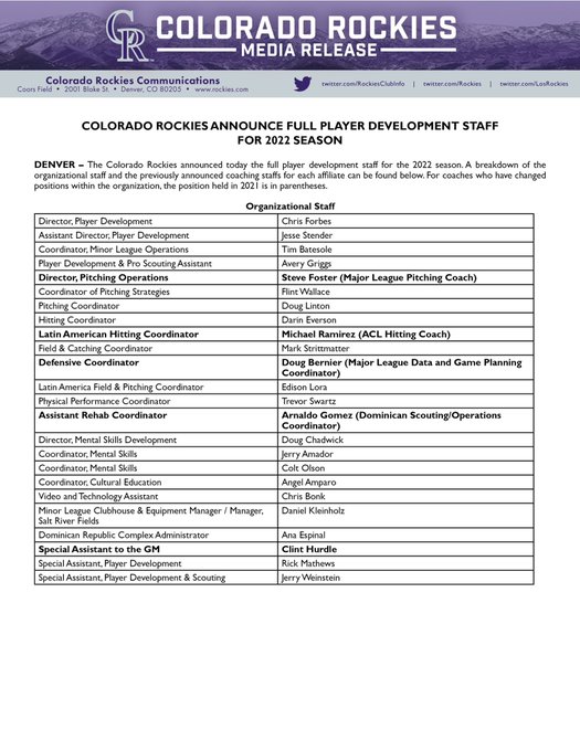 Rockies Announce 2022 Player Development Staff